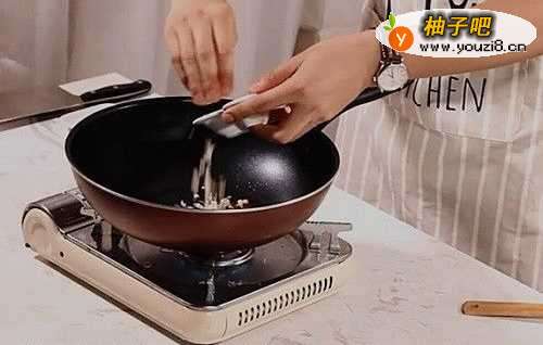 55.将肉末、木耳、青笋丝放入锅中,煸炒均匀
