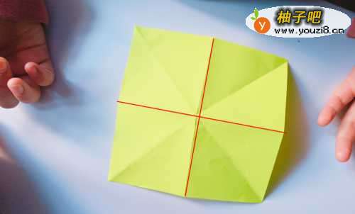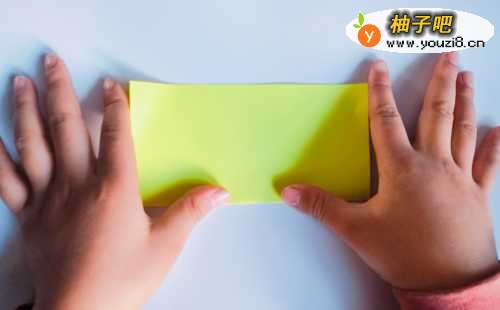 3取一个正方形,沿着正方形的中线对折,然后将底部向上翻折。