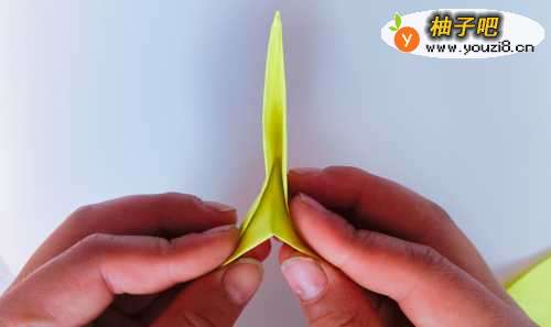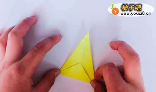4折好后沿着下方的折痕,向中间折叠。折出下图中的形状。然后分别将剩余的四正方形纸张,折成相同的图案。