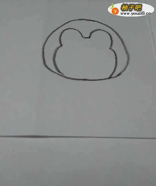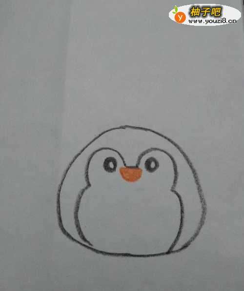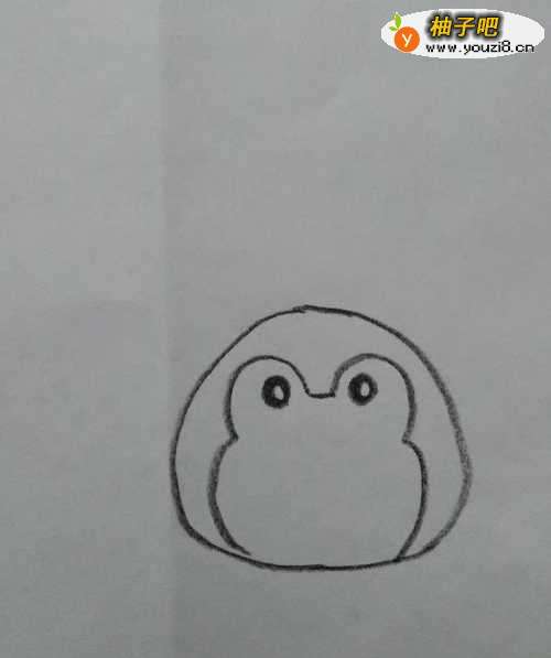 3在椭圆形里面,画四条对称的弧线,中间用一条短短的横线相连,表示企鹅的脸和白肚皮。