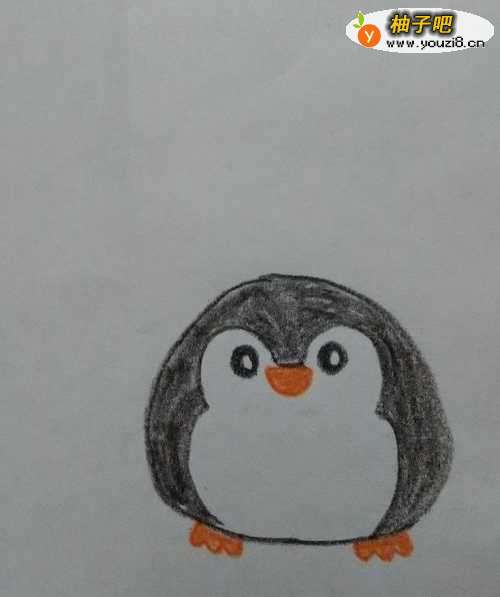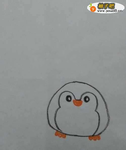 6再用桔色笔在身体下方画两条波浪形曲线,并涂上颜色,表示企鹅的脚。
