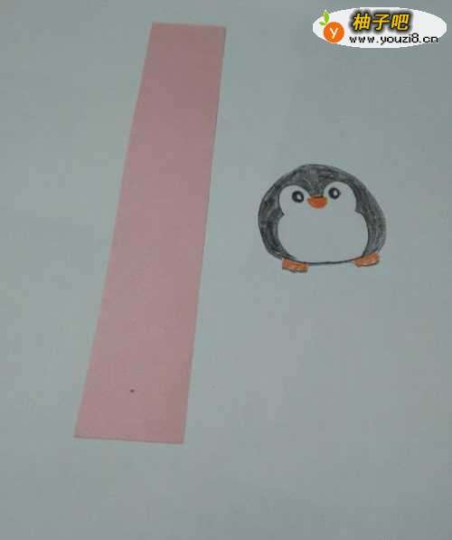 9用剪刀从彩纸上剪下一个宽宽的、长长的小条,长度要比企鹅身体周长多一点。
