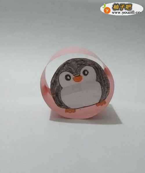 14把纸圈反过来,放在桌上,当小纸圈滚动时,里面的小企鹅也跟着滚动,会滚的玩具就做好了。