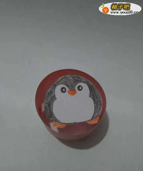 用彩纸粘成一个纸圈,当作轮子,画一个小企鹅,剪下来,粘在纸圈里面,纸圈滚动,小企鹅也跟着滚动,下面就做一个会滚的玩具。