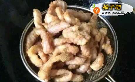 5锅中添上油,待将油烧热后,放入裹上面糊的猪肉,中火开始炸制,待将猪肉炸至变色后,即可捞出。