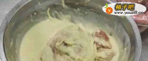 4将腌制好的猪肉,放入在面糊中,裹上一层面糊。