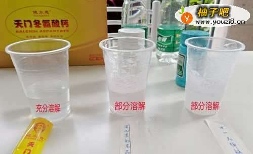 因为螯合钙是粉剂状的,为了实验的公平起见,将另外2款颗粒状的钙用磨药器磨成粉状,分别倒入同等容量的纯净水中(用纯净水,不含矿物质,结果更准确),最左边螯合钙10秒速溶,另外两款钙搅拌后仍然只是部分溶解。