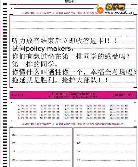 5正如图片上的吐槽一样,听力是听完立刻收卷,这就表示没有时间让你先在试卷上做标记再涂到卡上,并且前面作文没写完这回也没时间补。所以一定要养成即听即涂的好习惯,没听清的也要涂上,蒙错总比直接放弃好吧。