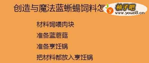 6最后总结一下:准备-材料饲喂肉块-准备蓝蘑菇-准备烹饪锅-把材料都放入烹饪锅,详细如下图