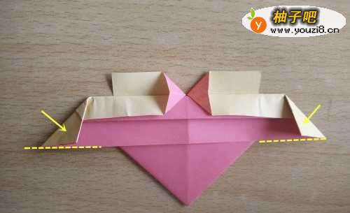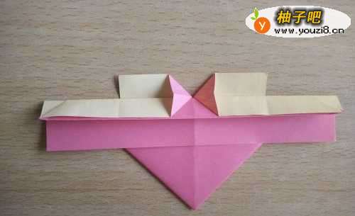 7将上方两个直角分别对齐下边折过去,将纸翻面,一个漂亮的天使爱心就折好啦。