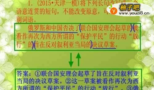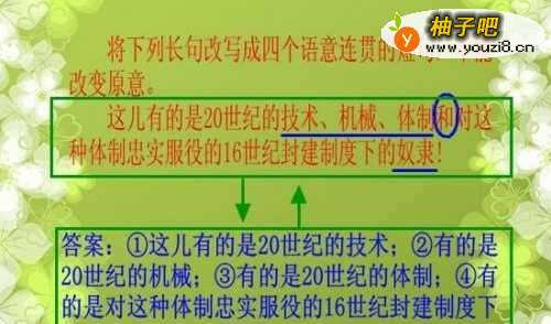 “长短句变换”属于句式变换题型,主要考查学生能根据表达需要对长句和短句进行相互变换,使之灵活生动有力地表达思想情感的能力,属于语言表达的范畴。解答“长短句变换”题要注意以下几点: