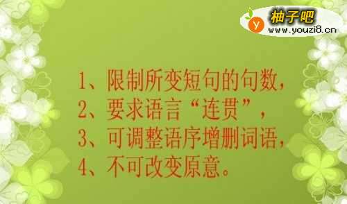 长短句变换的题型会限制所变短句的句数,语言要求“连贯”,可调整语序增删词语,不可改变原意。例如: