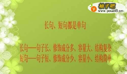 所谓长句,是指句子长、修饰成分多、容量大、结构复杂的单句。所谓短句,是指句子短、内容单薄、结构简单的单句。长句有利于严密、精确、细腻,气势磅礴地表情达意。短句节奏明快、句义简单,能简明生动地写人叙事,反映事物的迅速变化,表达作者或人物紧张、激越的情绪,或果断、肯定的语气。