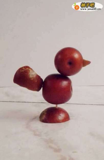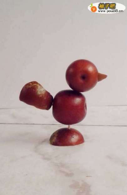 今天用大枣做一只小鸟,做法是,用三个枣和两支牙签,一个枣做鸟的身体,一个枣做鸟头,一个枣切成鸟的尾巴、嘴和脚托,利用枣上的眼当鸟眼,做完又好吃又好玩。
