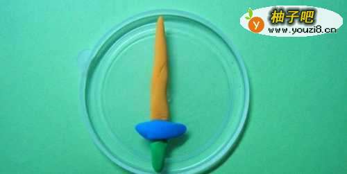 在粘土的箱子里,取出三种颜色的粘土,用手把粘土揉成条形,接着将三部分粘在一起,制作了一把粘土宝剑,放在小盘子上,如下图所示。