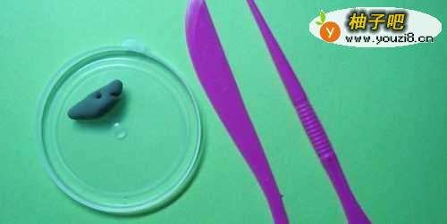 4接着,取出灰色的粘土,用手把粘土揉成一个小长条形,并捏成小乌龟的头的部分,用小工具绘制嘴巴和眼睛,放在小盘子上,如下图所示。