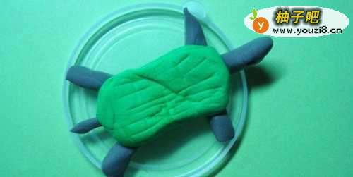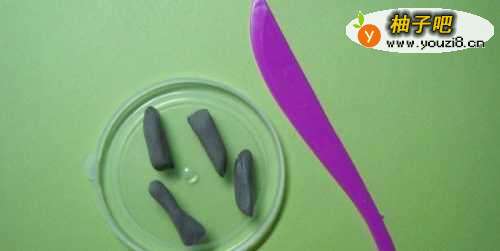 3然后,取出灰色的粘土,用手把粘土揉成一个长条形,并分成4条,作为好奇的小乌龟的腿脚部分,放在小盘子上,如下图所示。