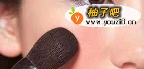 根据五官比例,腮红的位置应修饰在颧骨的下方。为了使长脸型向"v"字形靠近,应该做横向晕染。