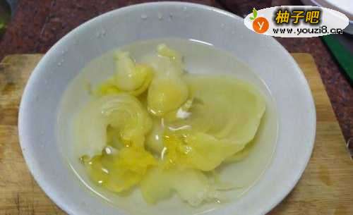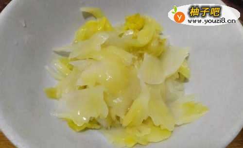掰下咸菜的叶瓣,放在清水中浸泡10分钟左右,除去过多的咸味