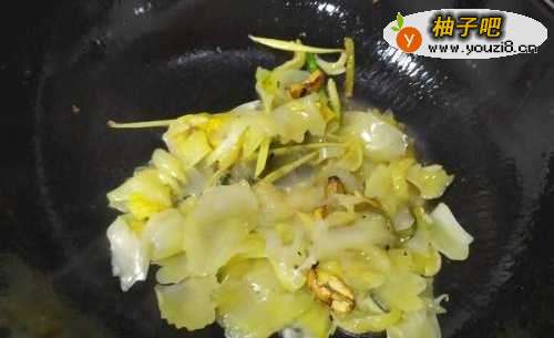 7接着,在锅中倒入适量食用油,把蒜头炒至变黄,然后加入姜丝和葱白,炒出香味后加入咸菜,继续炒半分钟