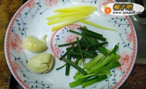 5接着,拍2瓣蒜头,切点姜丝和葱段,记得把葱白和葱绿分开