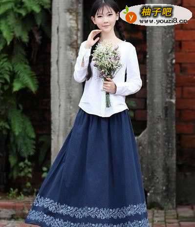 搭配二:藏青色长裙+白色衬衫白色衬衫是我们日常穿搭中的必备单品,简单、大方又非常百搭,搭配一条藏青色长裙,特别有文艺气质。