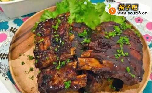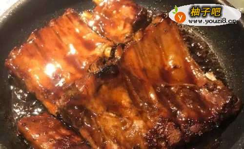 5接着将酱汁倒入锅中,并用汤匙将酱汁淋在猪肋排上,盖锅盖小火续煎3分钟后翻面,再用汤匙把酱汁淋到猪肋排上,再盖锅盖,约翻面2-3次;待酱汁收略干后即可装盘