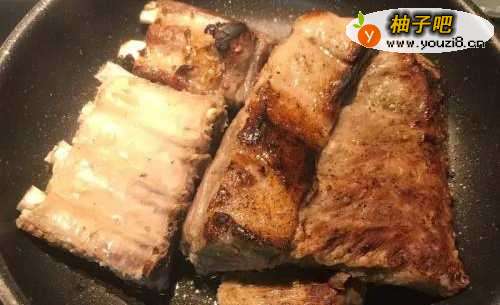 4平底锅加入少许香油,猪肋排肉朝下,盖锅盖小火煎到金黄。此时先将酱汁调好。翻面继续煎
