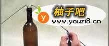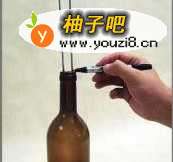 3把弯曲折过后的一端铁丝插入红酒瓶,插入的深度以铁丝刚过瓶颈为适宜。用马克笔在瓶口处的铁丝上做好标记。