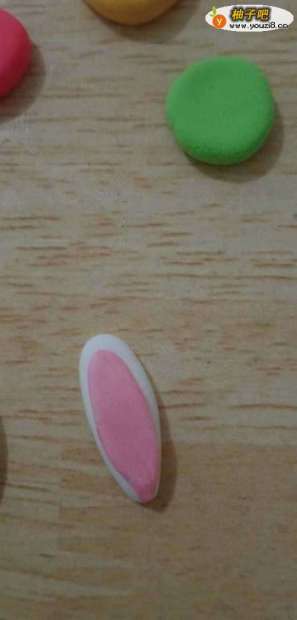 2跟白色耳朵一样,取两个粉红色粘土用同样的方法压两对耳朵,但是粉红色耳朵要比白色耳朵小一点薄一点