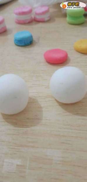 首先用白色的粘土捏两个圆球,然后白色的粘土捏成长条形用勺子稍微压扁一点,作为兔子的耳朵