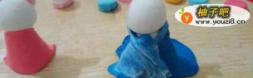 4接下来就是帮小兔子上装了,用蓝色粘土和红色粘土分别用勺子压扁压薄后剪掉多余的粘土,将红蓝色粘土粘在兔子的身体上,多余的部分可以用剪刀剪掉