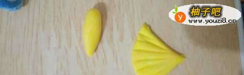 5然后我们给小兔子做一些装饰,在白色粘土里混入一点点藤黄,调和成黄色粘土,用剪刀剪成一个三角形,另外一个捏成胡萝卜的形状