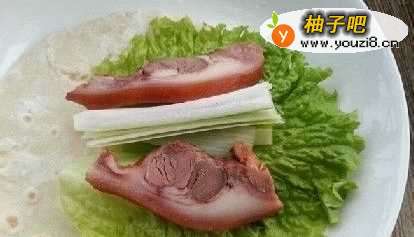 17在把面饼放底下,放上生菜,猪头肉,大葱,翻炒好的肉丝,最后把面饼卷裹起来就可以吃了。