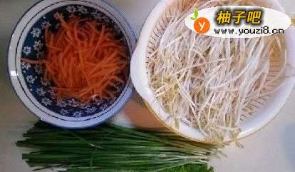 12绿豆芽洗干净沥干水份,胡萝卜切成丝,韭菜洗干净沥干水份切成段。