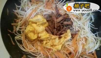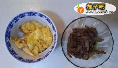11准备食材,鸡蛋打散炒熟,肉丝加入酱油,淀粉,适量的盐后炒熟。