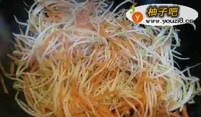 13热锅冷油放入姜丝,倒入绿豆芽和胡萝卜丝翻炒均匀。