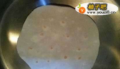9当面饼开始起泡泡的时候等1分钟左右翻面。翻面后两面都烙到有黄颜色的点的时候在烙2分钟左右。(一定要注意别烙糊了)