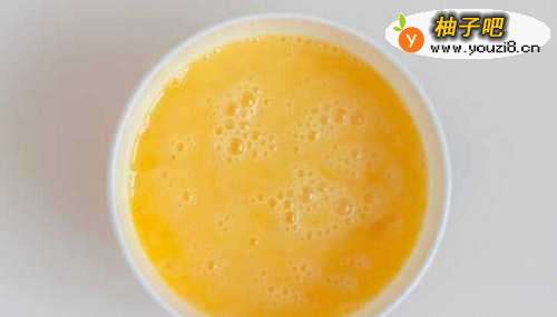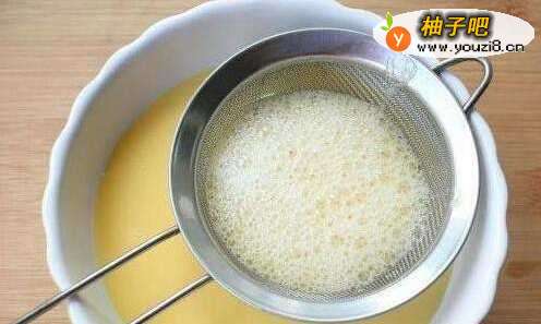 2加入事先准备好的水,水量约为碗中鸡蛋液的1.5倍,搅拌均匀。使用勺子或漏网勺将鸡蛋液中的泡沫及絮状物清除。
