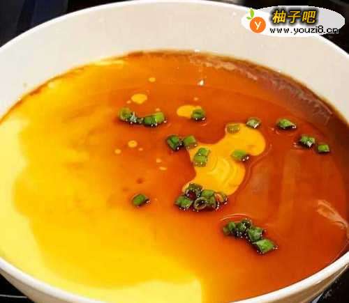 4将蒸好的鸡蛋羹取出,去除保鲜膜。将鸡蛋切花,倒入适量酱油及半勺猪油,撒上葱花,营养美味的鸡蛋羹便做好了。