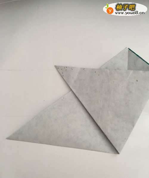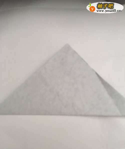 第一步 把一张16厘米X16厘米的正方形绿色彩纸 从下向上对角折叠