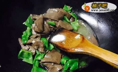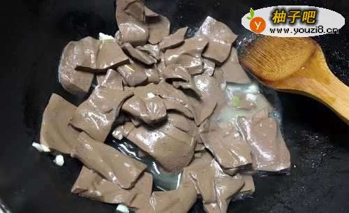 4接着开火,锅烧热之后放少许油,油热之后把蒜瓣放进去煸香,香味出来再把鸭血倒进去翻炒,翻炒1分钟左右把青椒倒进去继续翻炒!