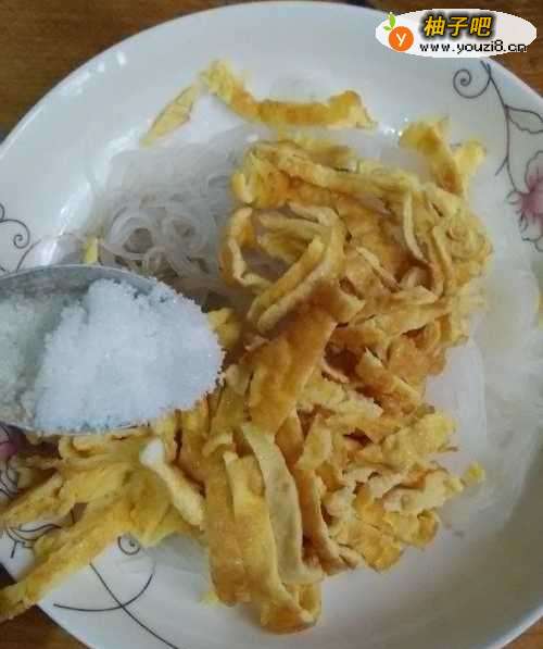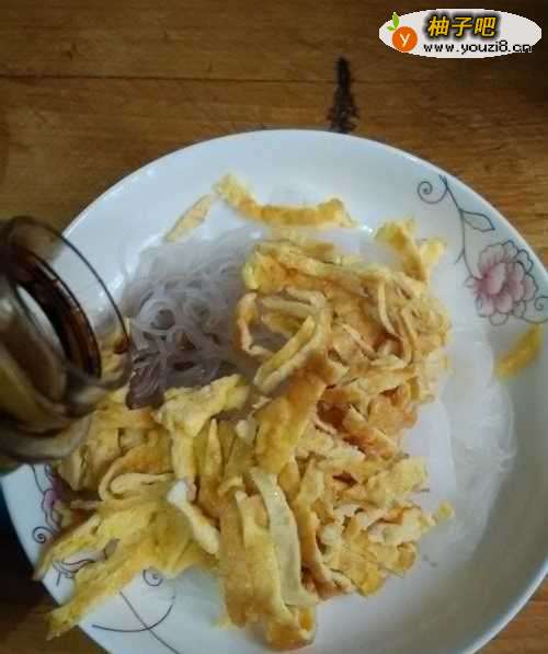 6再将鸡蛋丝放入盘中,放在粉丝上面。在盘中倒入适量的醋。