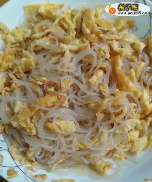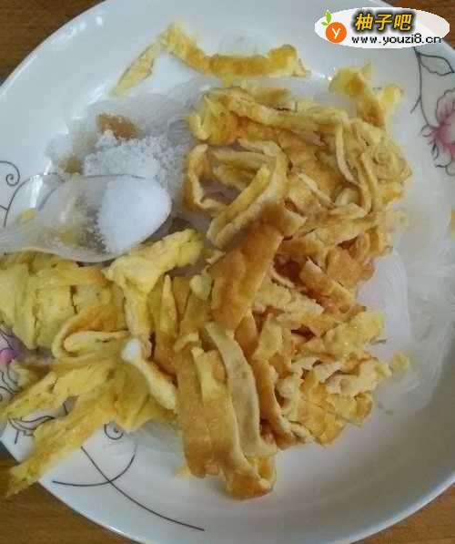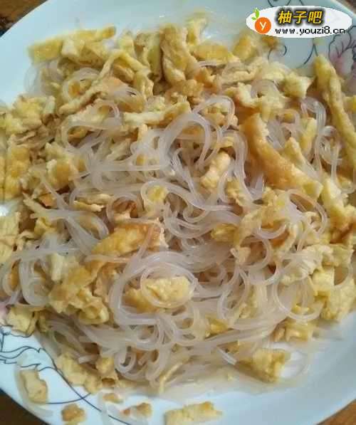把鸡蛋炒熟,切成丝,和粉条一起拌,加上白糖和醋,吃起来酸甜可口,一点也不腻。
