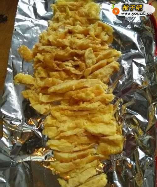 4将鸡蛋炒熟后,用刀将鸡蛋饼切成细丝。