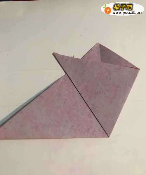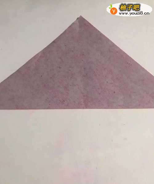 第一步 将一张16厘米长 16厘米宽的正方形红色彩纸 先按照图示摆放 然后从下向上对角折叠