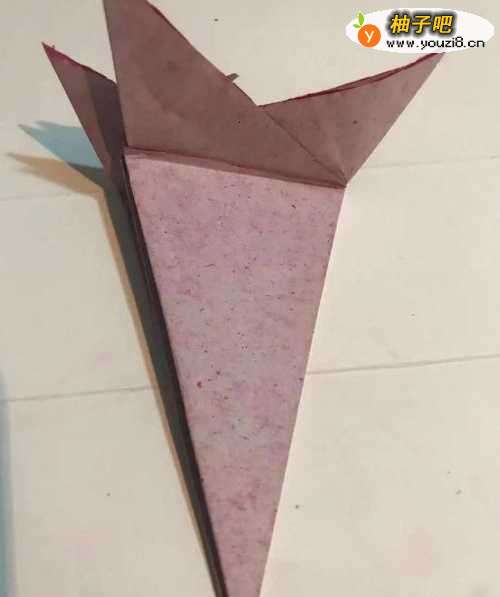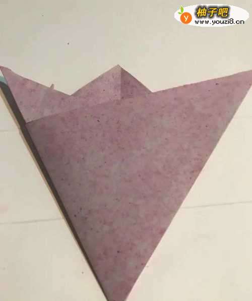 4第四步 折成三等分之后 左右翻过来 再左右对折一遍 然后把大头处最低的那页彩纸向下折一道折痕 作为画图不能超过的界限