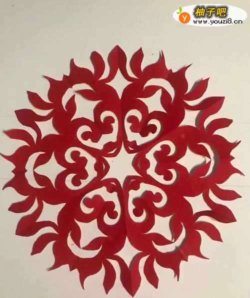 7第七步 剪完外围多余的彩纸之后 再剪各个细节部分和镂空的部位 还有其它涂实的地方等等 都剪完之后 取开铺平就行了