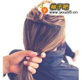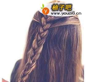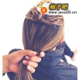 2当完成第一股三股辫的编织之后,都要从旁边不断加入新的发束来进行编织,一直这样进行四到五次即可,然后再进行简单三股麻花辫编发,至发尾用橡皮筋固定好。