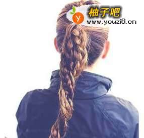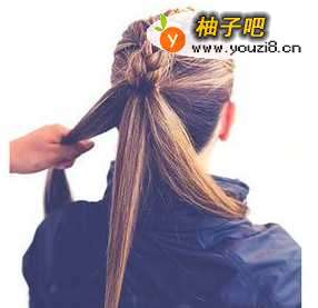 6取掉大发夹,让四股发辫两两缠绕在一起,然后再合并,这样就成一款饱满的学生马尾辫了。